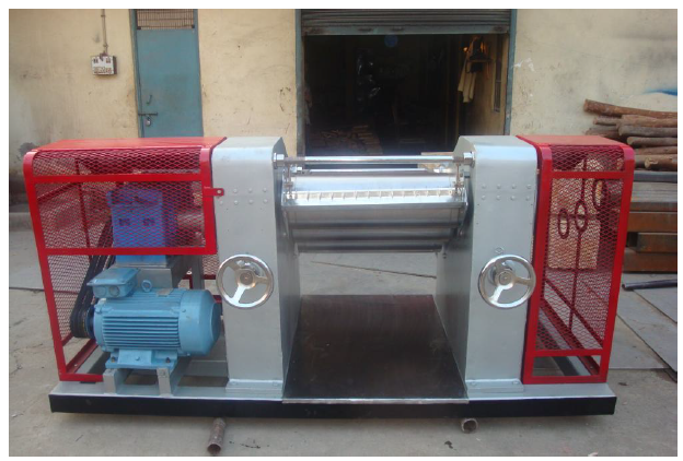 Three chilled, hardened, hollow, polished rolls placed on inclined bed, with variable speeds, driven by geared motor, Complete with feed hopper, scrapping blade with adjustment for film removal, cooled water circulation arrangement in each roll.