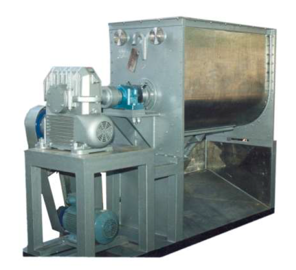 This horizontal double ribbon mixer consist of horizontal U-shaped tank, top cover with (or without) openings, single shaft equipped with double layers ribbon mixing agitator, transmission unit, support frame, sealing element, discharge structure and so on. Ribbon blades are always two layers. Outer layer ribbon make materials get together from two ends to center and inner layer ribbon make materials spread from center to two ends. Materials forms vortex during repeatedly movement and homogeneous mixing are achieved.