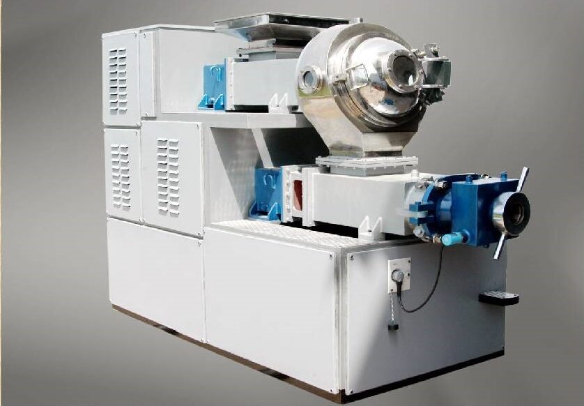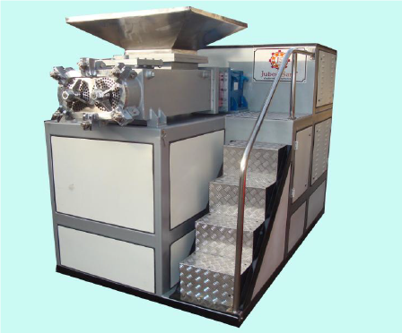 Three chilled, hardened, hollow, polished rolls placed on inclined bed, with variable speeds, driven by geared motor, Complete with feed hopper, scrapping blade with adjustment for film removal, cooled water circulation arrangement in each roll.